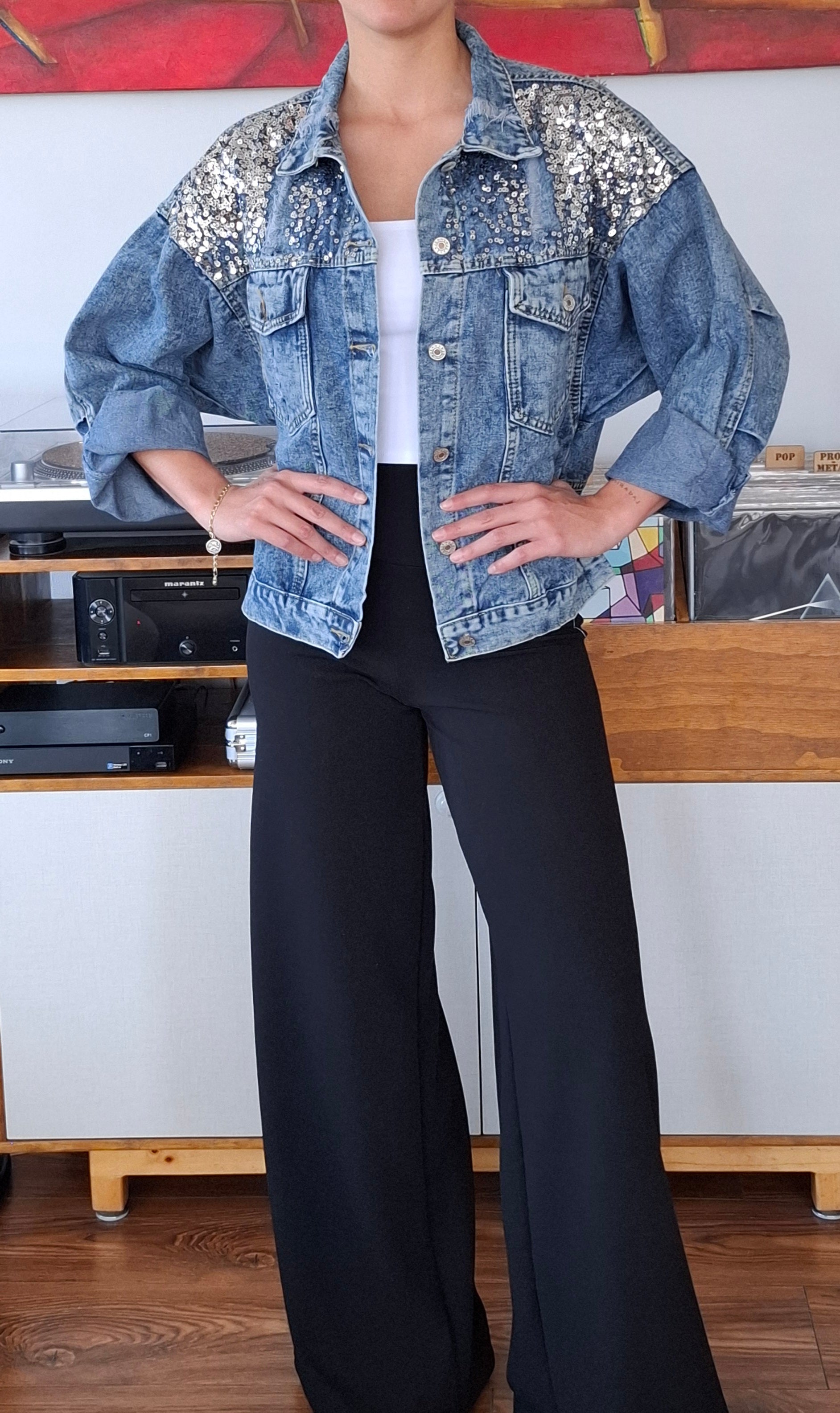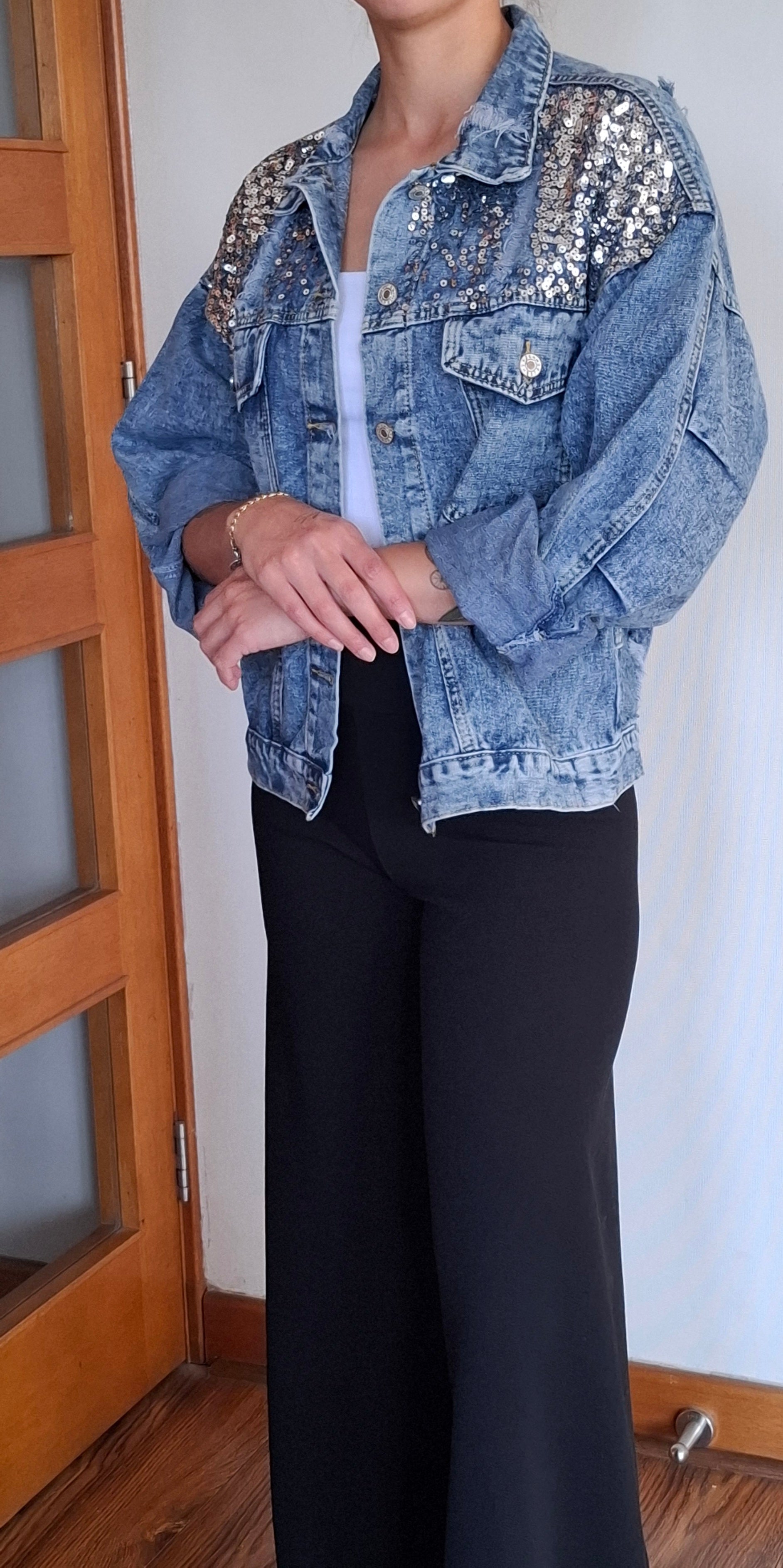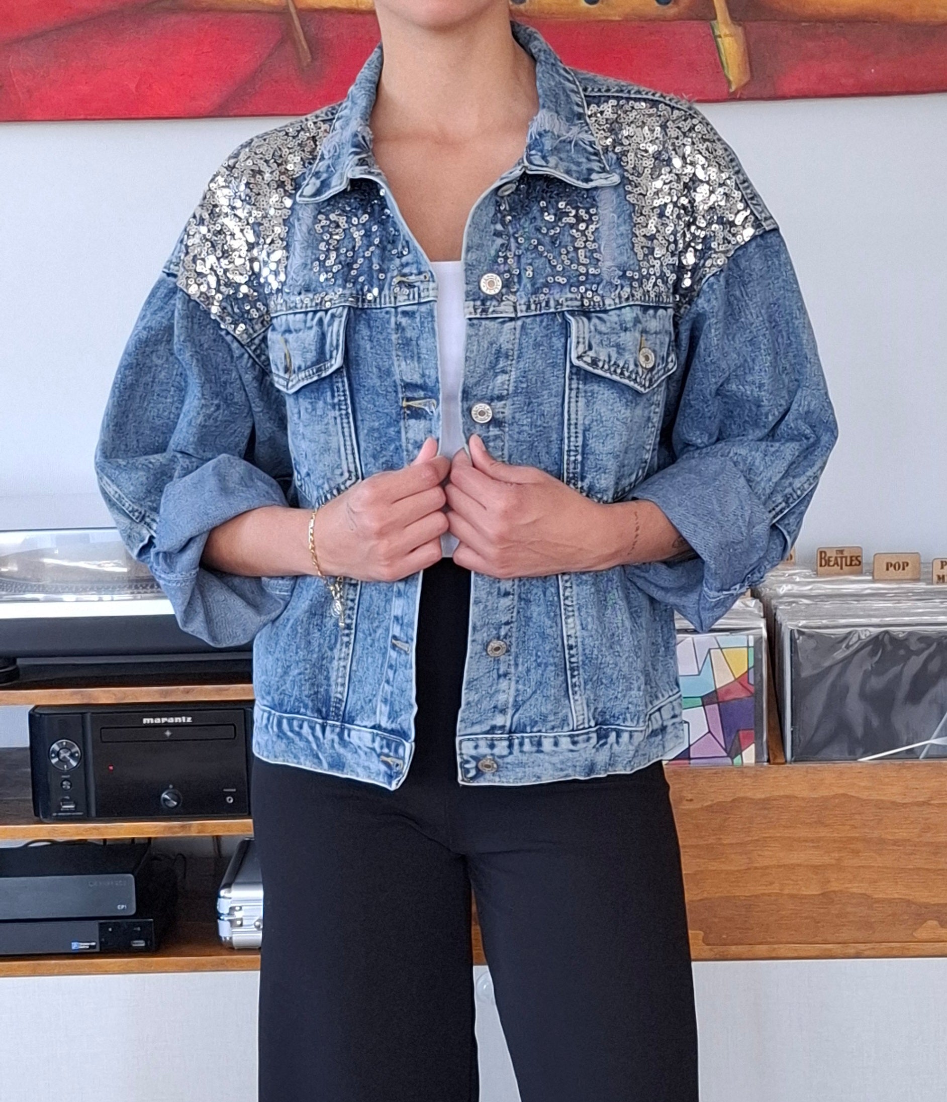 Chaqueta de Jeans Azul con lentejuelas plateadas , modelo Oversize. (no es elasticada)