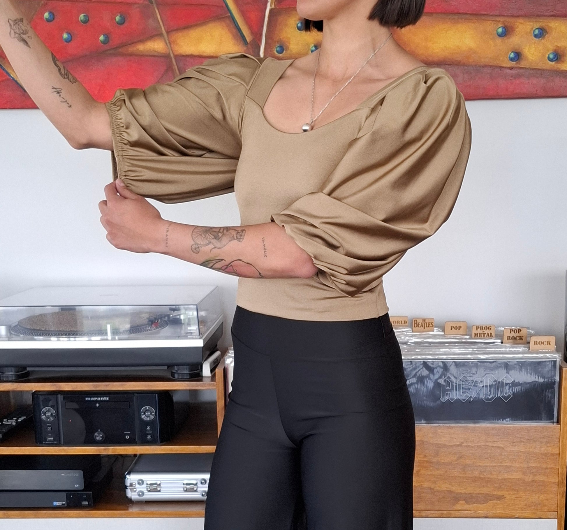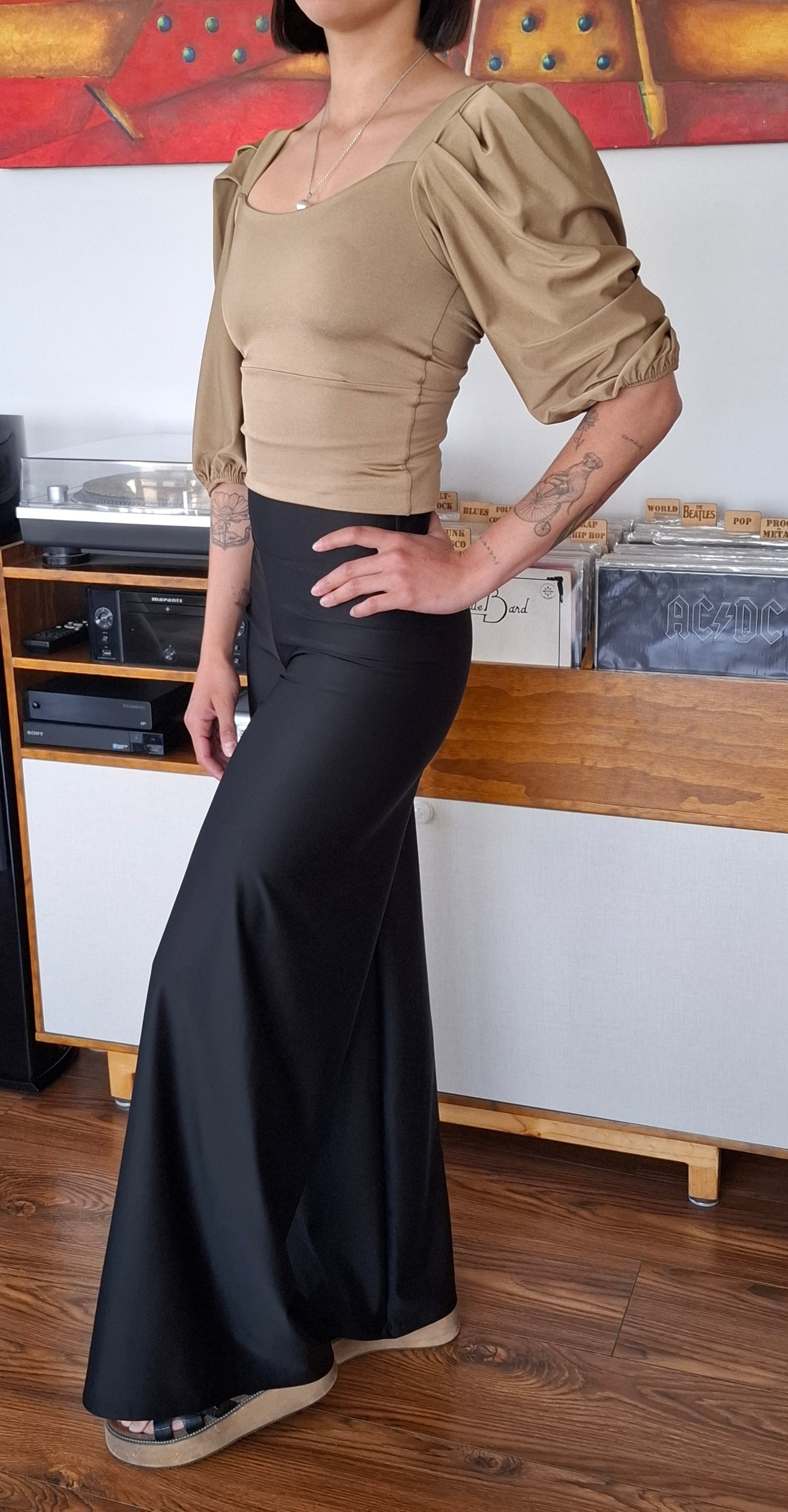 Detalle en su manga tipo globo, tela elasticada , confección Eni Villavicencio
