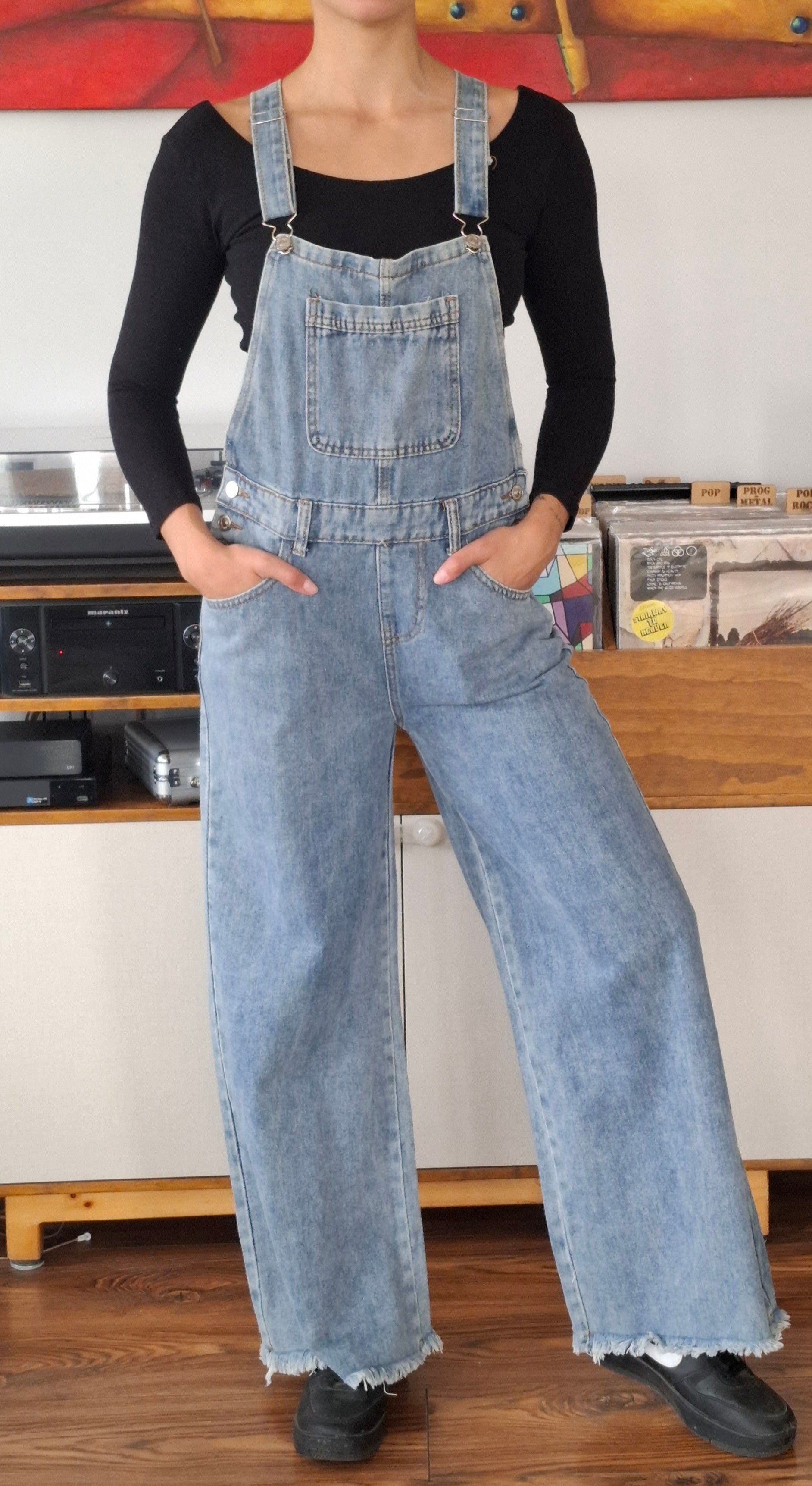 Jardinera de jeans pierna ancha y corte desflecado con tirantes ajustables de la nueva colección 2025 .