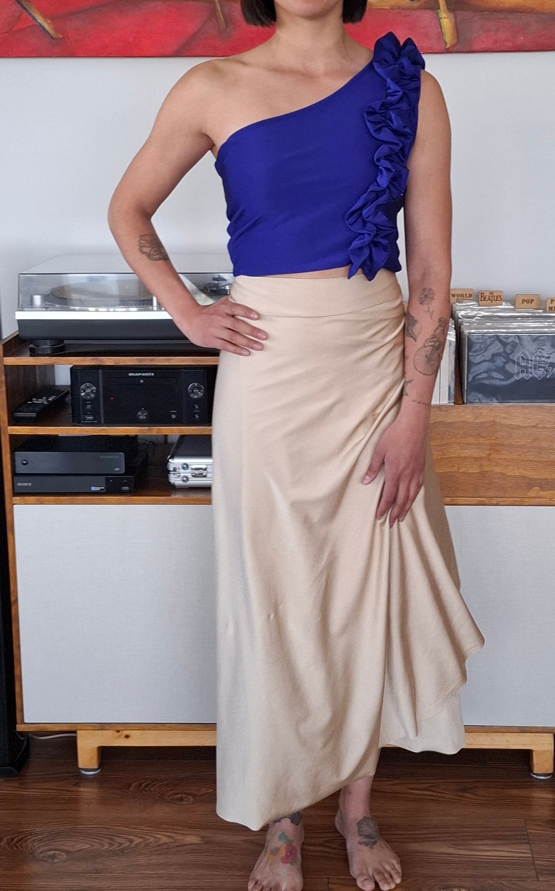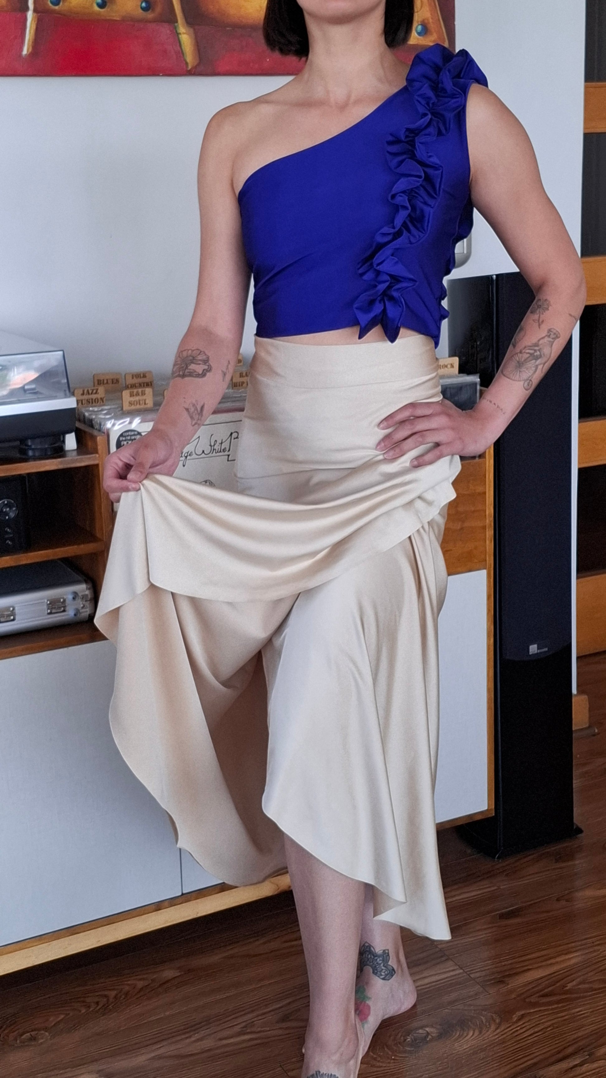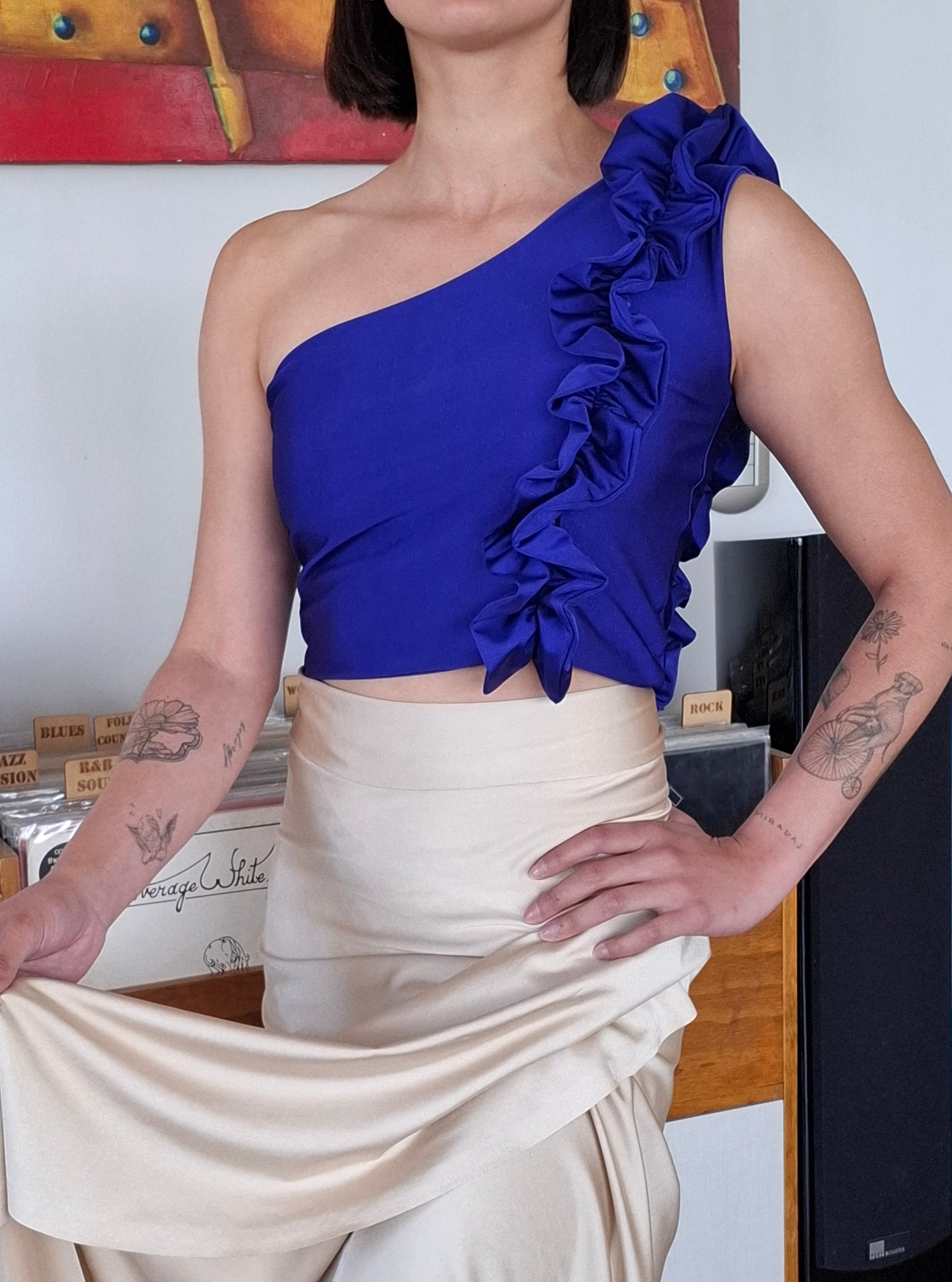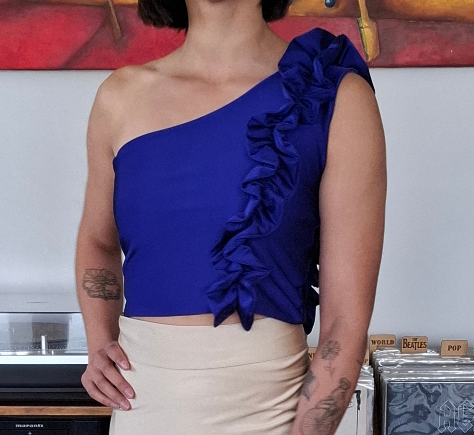 Crop Top asimétrico elasticado con detalle de vuelos en el hombro confección Eni Villavicencio
